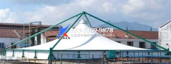 首先,對污水池加蓋處理,采用抗腐蝕性強的PVDF膜材,鋼結構在外面懸掛的方式,既發揮了氟碳纖維膜的抗腐蝕性能,又避免了鋼結構與腐蝕性氣體的接觸,延長了鋼結構的使用年限;