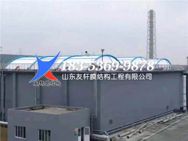 首先,對(duì)污水池加蓋處理,采用抗腐蝕性強(qiáng)的PVDF膜材,鋼結(jié)構(gòu)在外面懸掛的方式,既發(fā)揮了氟碳纖維膜的抗腐蝕性能,又避免了鋼結(jié)構(gòu)與腐蝕性氣體的接觸,延長(zhǎng)了鋼結(jié)構(gòu)的使用年限;